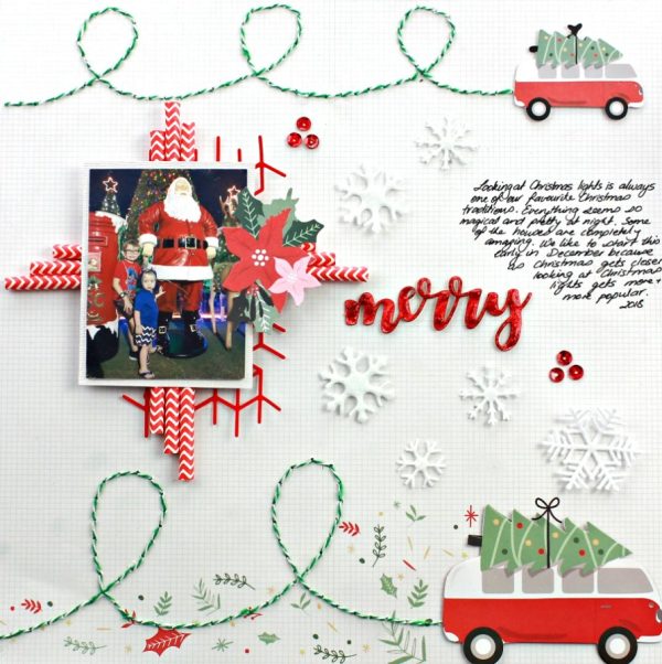 Alicia’s merry layout has fun stitching behind VW buses, hand written journaling and die cut snowflakes. I love the depth behind the photo with festive drinking straws as well as the red glitter glue she added to her die cut title! Watch her process video at the Paper Crafts Secrets blog.