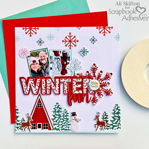 Ali’s Winter Fun layout has lots of depth and dimension from popping up images and the large die cut title with foam tape as well as a button badge and tiny pearls. I love how she took a printed border on the bottom of the paper and added the snowman, deer and more trees to complete the scene! Learn more at the Scrapbook Adhesives blog.