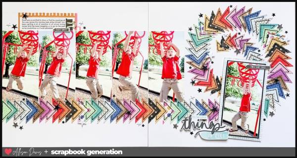 Allison started with a sketch as inspiration for her fantastic double page layout. She’s got rows of photos across both pages with layers of triangles stretching across and swirling around the last photo. Each triangle is cut from different pattern papers and stitched in black tread around the edges then over lapped with small stars coming along for the ride too. Learn more and find the original sketch at the Allison Davis 4 SG blog.