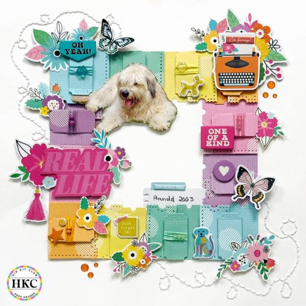 Here’s another example of simple layering, Anke has created a square frame around her layout made up of colorful tickets. Each ticket has another ticket, the same color, layered over top for a tone on tone effect. There’s also lots of layers of small embellishments, tickets wrapped in colorful twine, gems and white sewing. I came across her idea on the Hip Kit Club Instagram page.