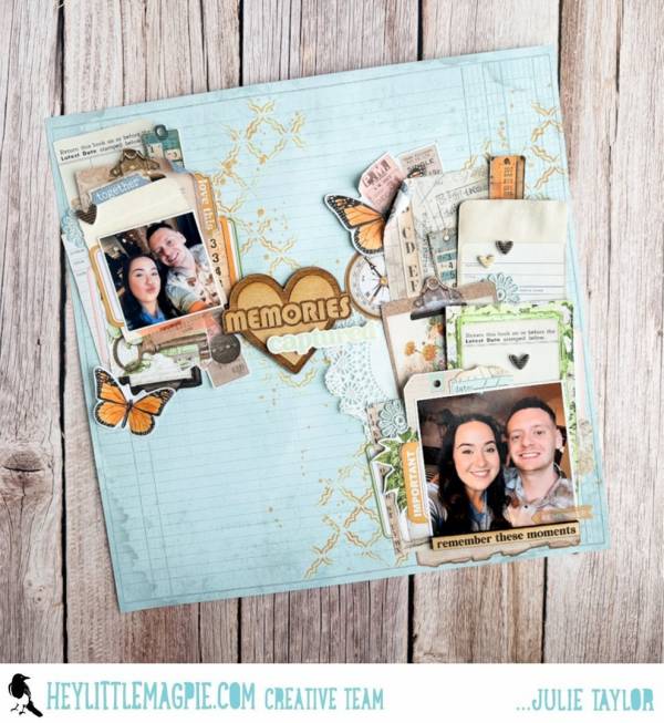 Julie’s beautiful layout started with blue pattern paper that she added brown rustic stenciling too and then she started her layers. Behind each photo are many layers of printed papers, all with a vintage feel, like tickets, library cards, tags, labels, book pages, vellum, fabric and paper doilies. For extra dimension there’s a large wooden heart along with smaller chipboard elements as well. Find all the info on the Hey Little Magpie blog.