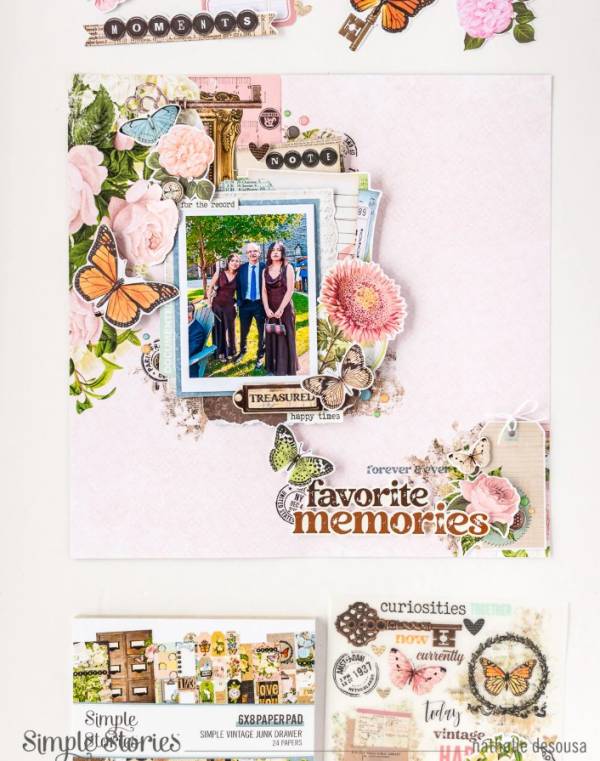 Nathalie used papers and printed embellishments with a vintage feel for her beautiful layout. Some are stacked and some are slightly fanned out with clusters of flowers and butterflies hovering around. Using rub-0ns on the base paper and popping up some layers with foam tape really gives a ton of dimension! Take a closer look at the Simple Stories blog.