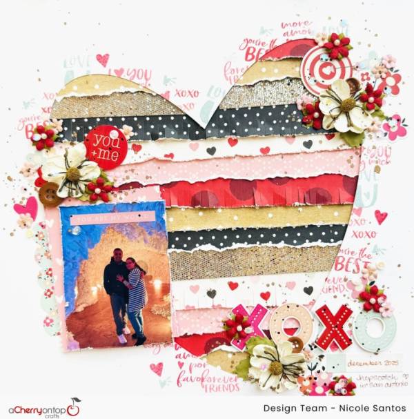 Nicole’s sweet page has many layers of pattern paper behind an open die cut heart. Some paper are torn and some are fringed for added texture. This is a great way to use of strips of left over papers! She’s also layered up 3D flowers, tucking in embellishments with them too, as well as adding some stamping around the heart. Take a closer look at The Cherry on Top blog.