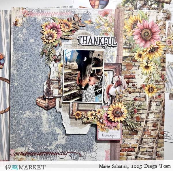 Marie’s darling boy and horse layout has a wonderful rustic flair with layers of pattern papers, some torn, along with fabric tape with lots of printed embellishments and a chipboard title on top. For more texture there’s stitching and paint splatter too. Learn more at the 49th and Market blog.