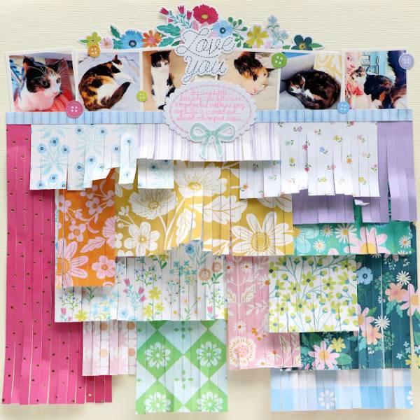 This cute kitty cat layout from Paige has a row of sweet photos along the top with the title, an oval for journaling and some flowers tucked behind. But the wow factor are the layers of fringed pattern papers, notice how they are different widths and lengths, this adds ever more special detail to the design. Take a closer peek at the Paige Taylor Evans blog.