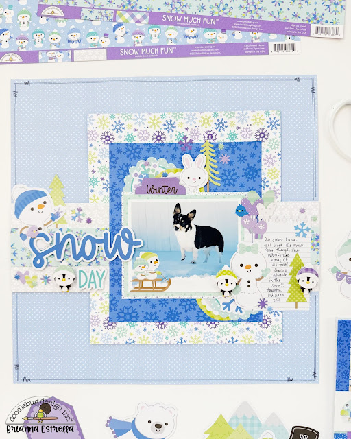 Layering doesn’t have to be thick and detailed you can keep it clean and simple too like Brianna did on her fun winter snow day page. Behind the matted photo are larger layers of pattern papers as well and a couple of long layered strips for a center border. I love all the cute winter critters and snowmen she got clustered about too! Find all the details at the Doodlebug blog.