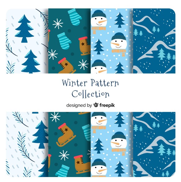 If you’re designing scrapbook layouts for Winter be sure to grab this group of fun printable pattern papers. These FREE downloadable designs include 4 different papers with Pine trees and twigs, ice skates and mittens, snowman faces and trees and snowy hills, all in shades of blue and white with pops of brown.