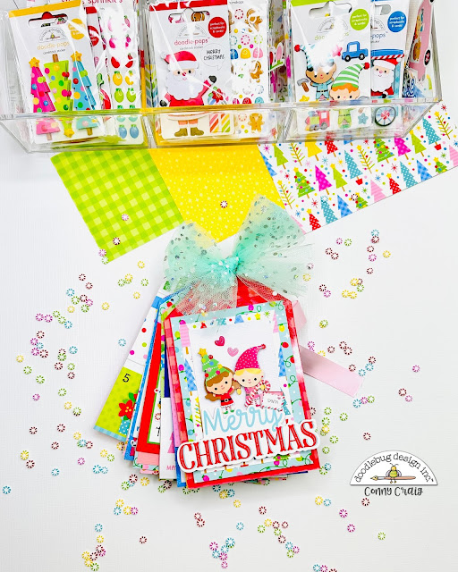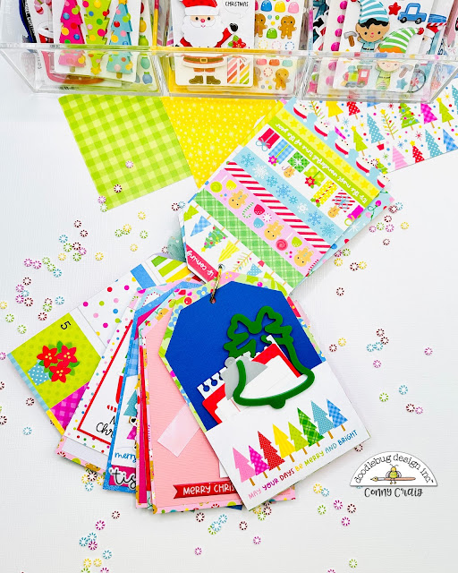 Looking to hold all your Christmas memories in one small place? Try creating a mini tag album like Connie did. She cut lots of tag shapes from coordinating pattern papers using a metal ring though the holes at the top to bind it, adding a pretty ribbon too. The cover is decorated with cute dimensional elf dies on layers of paper with a large die cut title.