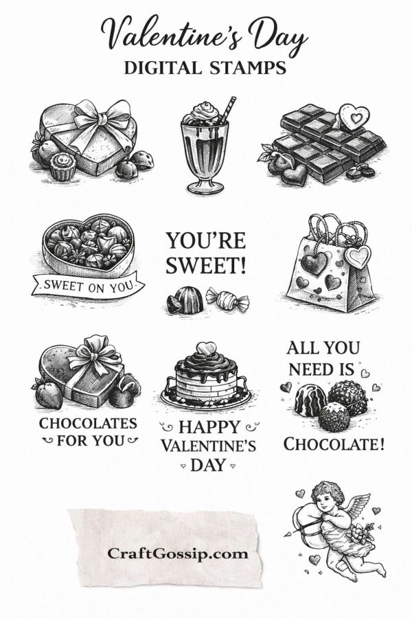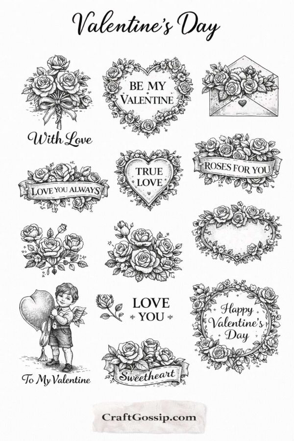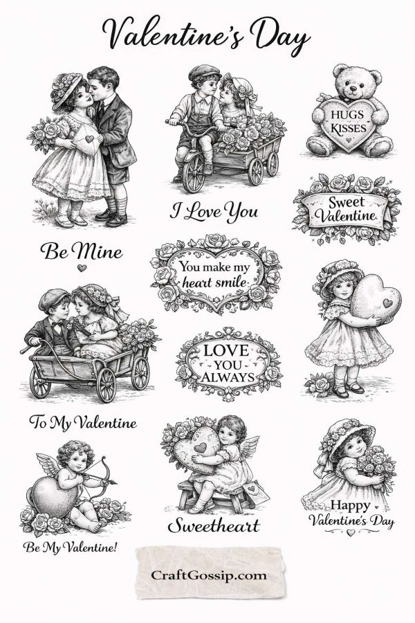 Designed especially for card makers and paper crafters, these printable stamp sheets feature classic vintage-style illustrations with generous spacing, making them easy to cut out and perfect for layering on handmade Valentine’s Day cards.