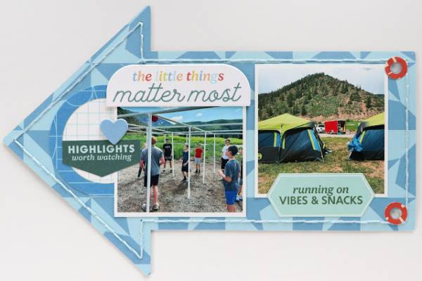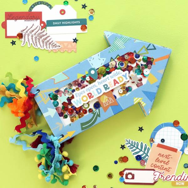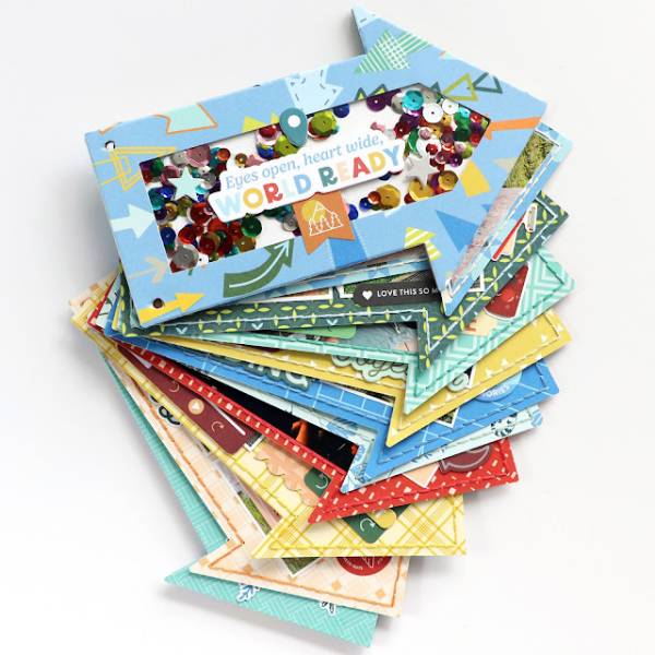 Paige captured all the fun of a boys camping trip in this arrow shaped mini album. The chipboard cover has arrow pattern papers, two blue O rings for binding, tied with ric rac and pom pom ribbons, and a cool shaker element in the center filled with sequins and stars. This long album measures 9″ x 6″ inches and can hold up to 33 photos.