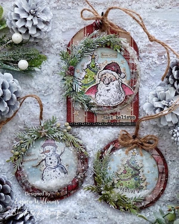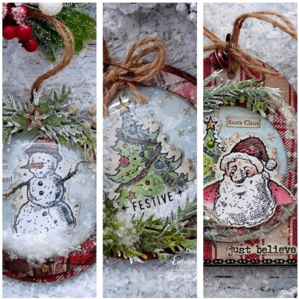 Emma used products from Tim Holtz to create these amazing stamped and mixed media Christmas tree ornaments. She used round dies, cardstock and plaid pattern papers to cut the circle bases and an arch for the ornaments, placing stamped images water colored with Distress Watercolor Pencils in the center along with some small sentiments. Two have clear domes to create shaker elements filled with Distress Snowflakes. For the greenery she used Distress Ink Sprays on paper and then die cut them out, adding them around the edges along with some Rock Candy glitter.