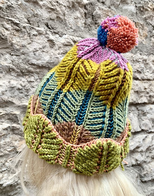 The hat uses two-color brioche and is worked in the the round from the bottom up. It uses DK weight yarn and can be made with or without stripes, so you can use as few as two or as many colors as you like. The projects section on Ravelry can show you lots of different versions with more or less striking color changes.