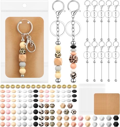 You Will Get: dive into creativity with our comprehensive set, featuring 12 beadable keychain bars, 120 leopard print beads (108 silicone round and lentil beads in 18 colors, 8 polygonal wooden beads, and 4 metal beads), plus 12 display cards and 12 packing bags; Everything you need for your DIY projects