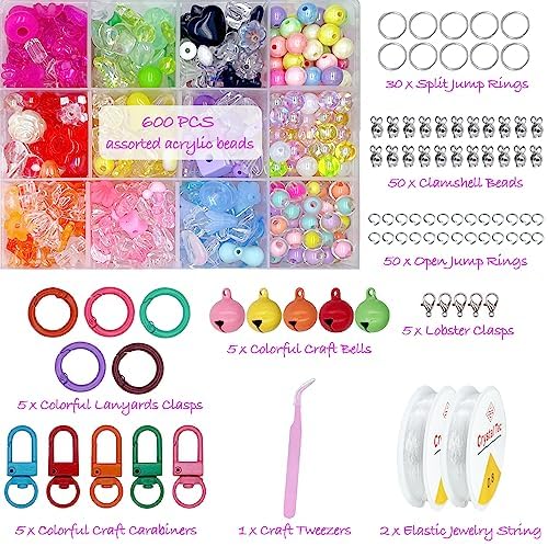 [All-in-one Jewelry Making Kit] Acrylic beads for jewelry making, provides all the beads, necessary tools and accessories for you to make elegant themed bracelet, necklace for everyday wear. Package Coming with total 600 PCS assorted acrylic beads(12 Color, 50 PCS each), 5 x Lobster Clasps, 5 x Colorful Craft Bells, 5 x Colorful Craft Carabiners, 5 x Colorful Lanyards Clasps , 50 x Clamshell Beads, 30 x Split Jump Rings, 50 x Open Jump Rings, 2 x Clear Stretchy Jewelry Cord, 1 x Craft Tweezers.